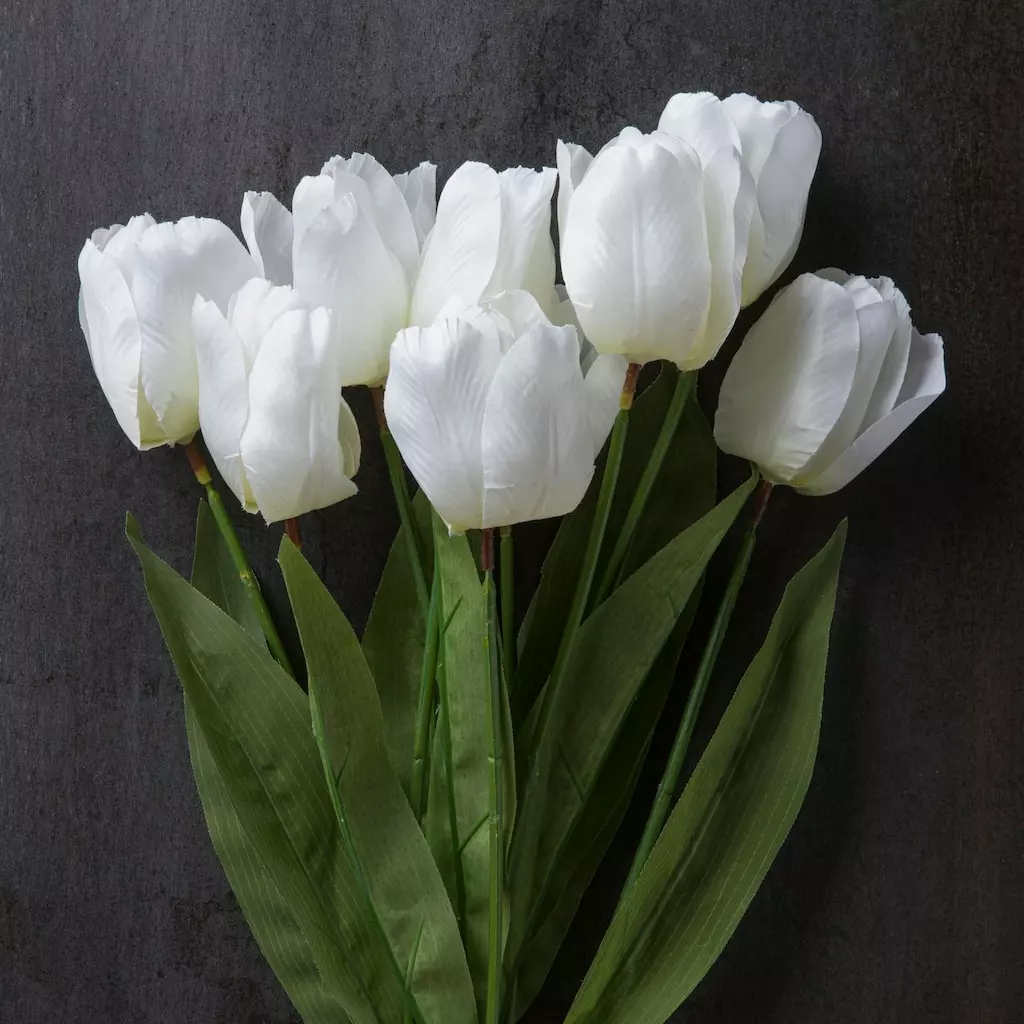 Place this charming tulip bush in a clear vase to brighten up your living room. Team it with other flowers to create a lovely tabletop display.