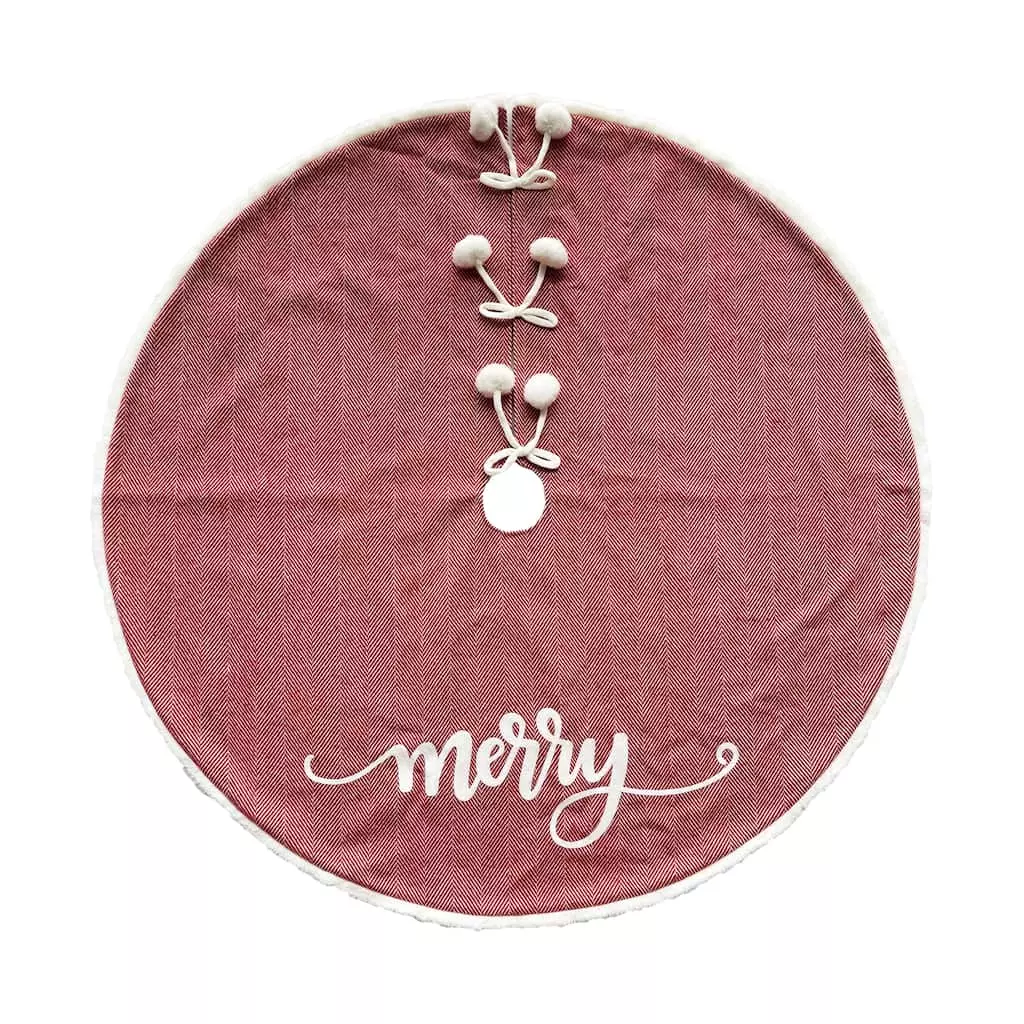 This “Merry” skirt with faux fur pom pom accents and trim is guaranteed to complement your tree. Team it with ornaments and lights for the perfect holiday display.
