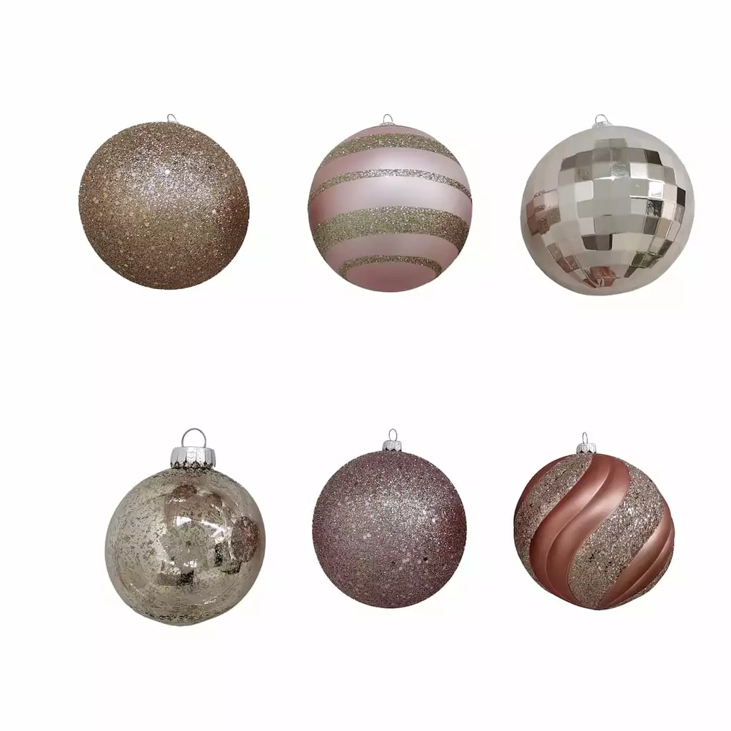 Give your holiday tree touches of shimmer and shine using this set of pink ball ornaments in a variety of patterns, textures and finishes. Their shatterproof design combines the beauty and luster of real glass with the unbreakable practicality of plastic, making them a great choice for bringing a bit of worry-free Christmas cheer to your dรฉcor.