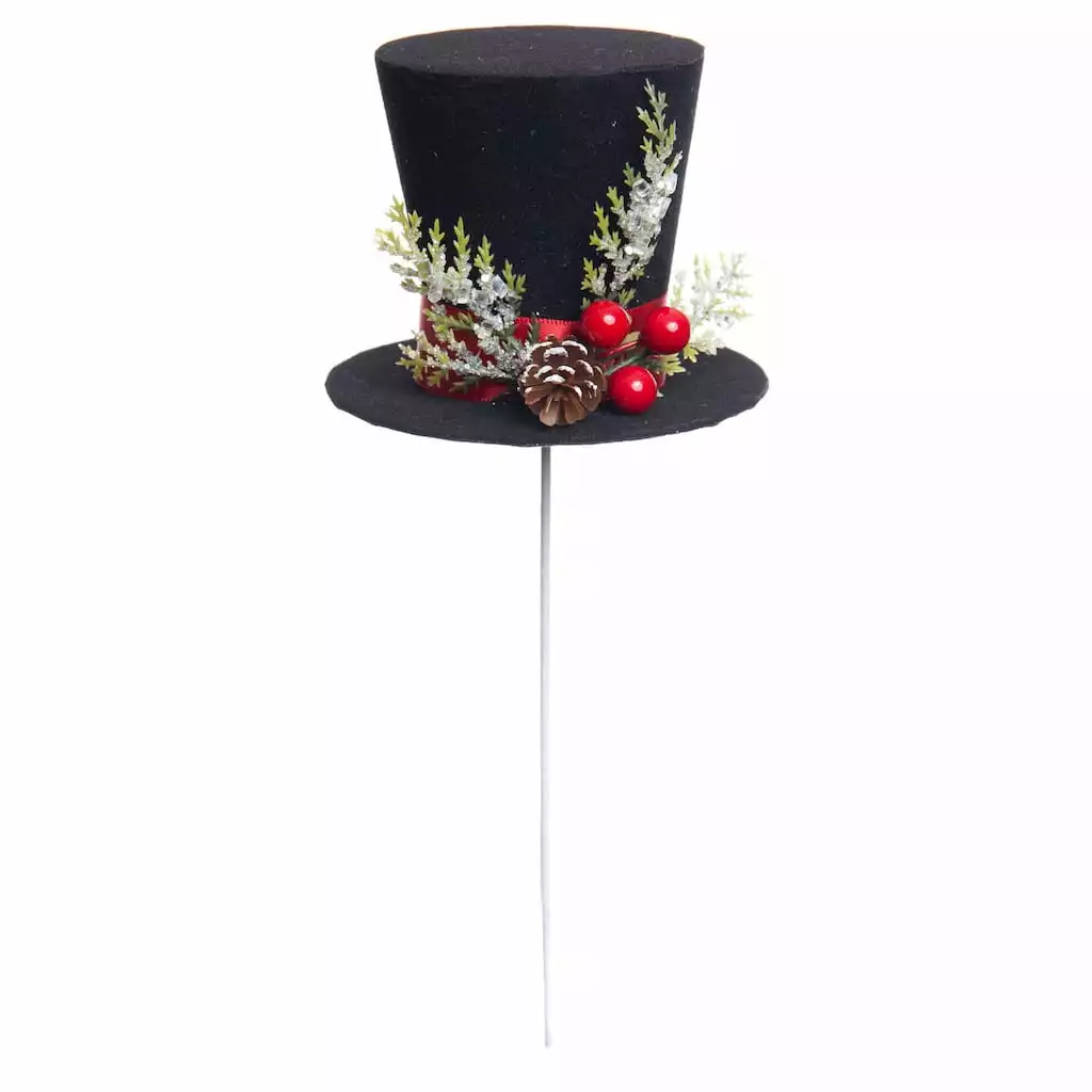 Add a fun, festive touch to your holiday dรฉcor by adding this adorable black top hat pick decked out with a frosted pinecone & bright red berries to your wreaths and floral arrangements. Use to give a little playful Christmas cheer to a vase of vibrant red blooms and lush greenery on a mantel or entryway table in your home.
