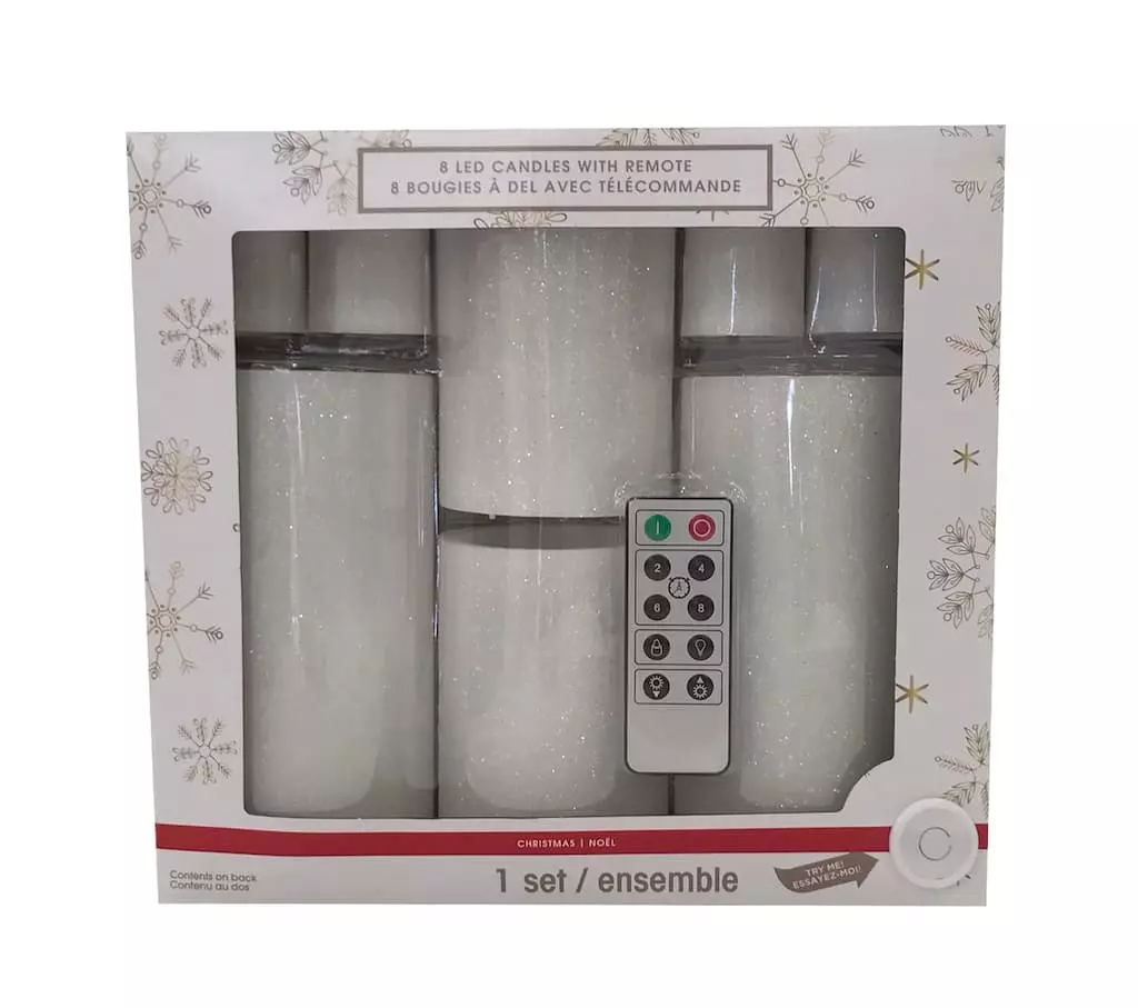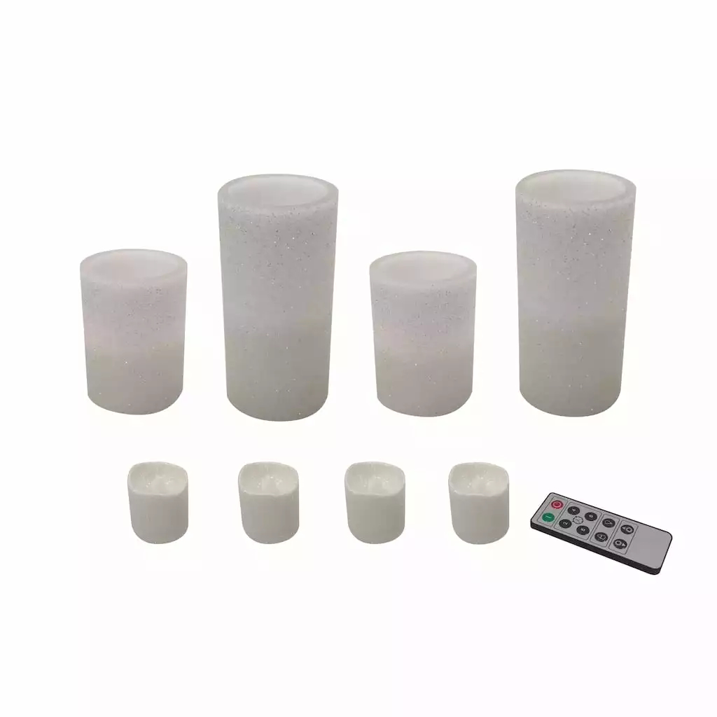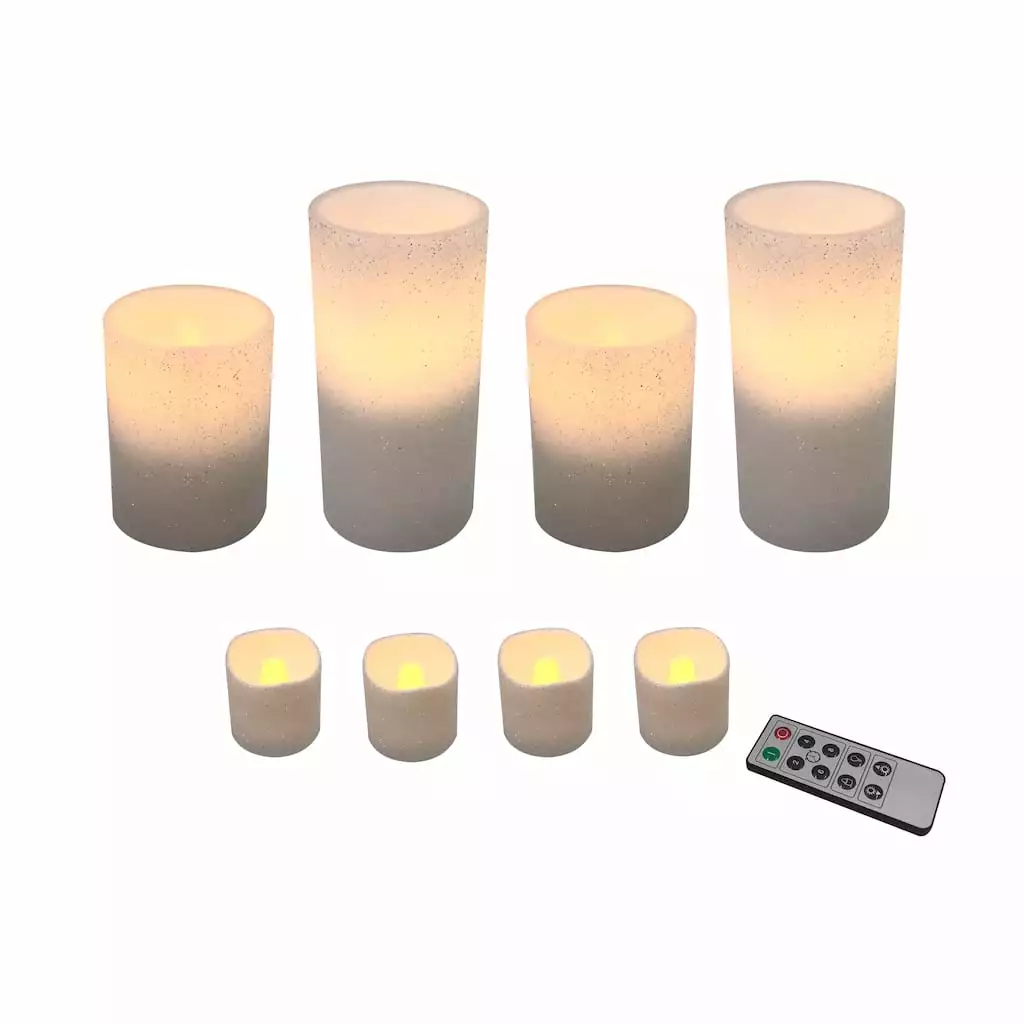 This beautiful glittery white LED candle set includes 8 candles and 1 remote. Perfect for safely adding an ambient vibe to your dรฉcor, each candle will transform your table, shelf, or counter with the push of a button.