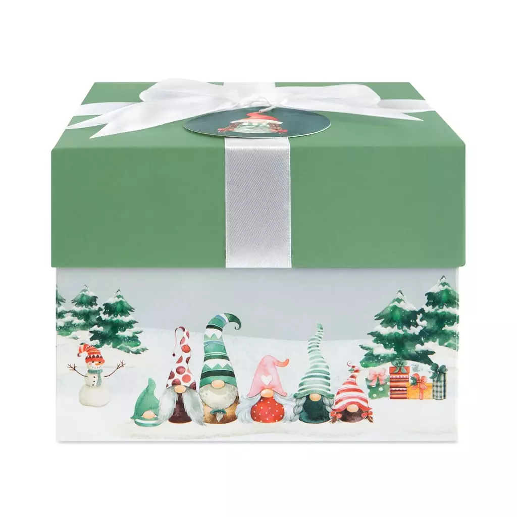 Featuring an adorable design of gnomes in oversized pointy hats celebrating the holidays, this charming box is a fantastic way to dress up your holiday presents with festive flair. With a pretty satin bow and coordinating tag, use for decorating under the tree or to hold a special gift sure to stand out as you celebrate the Christmas season with your loved ones.