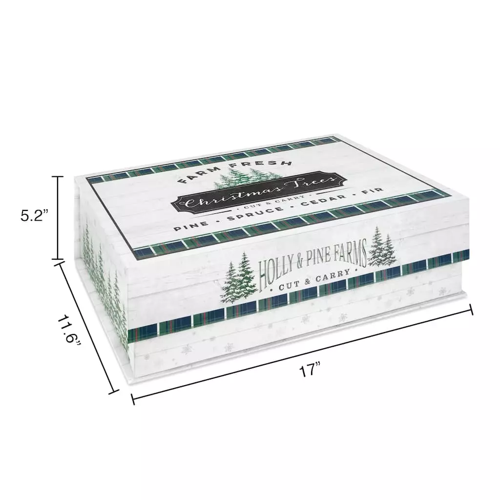 This flip top decorative box is the perfect piece for your home dรฉcor and storage. It features “Farm fresh Christmas trees” and a seasonal design with trees.