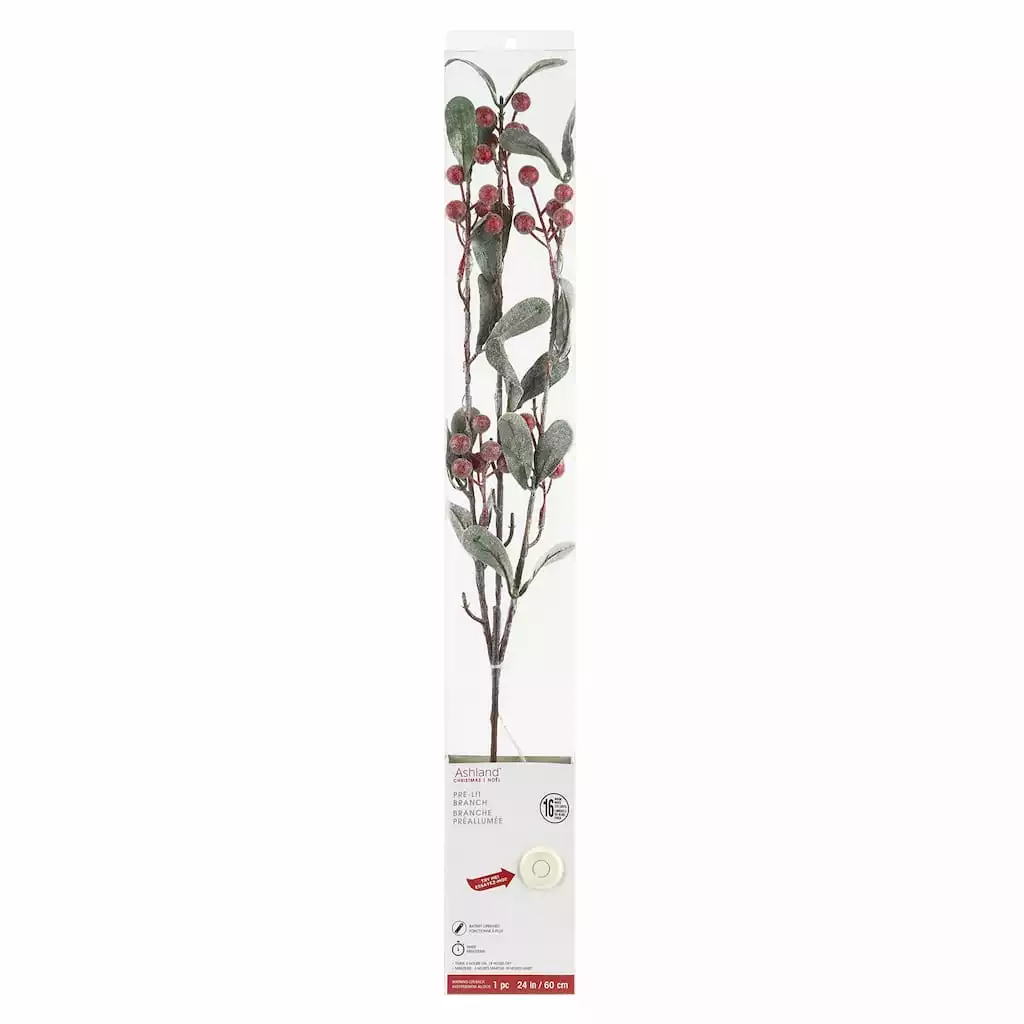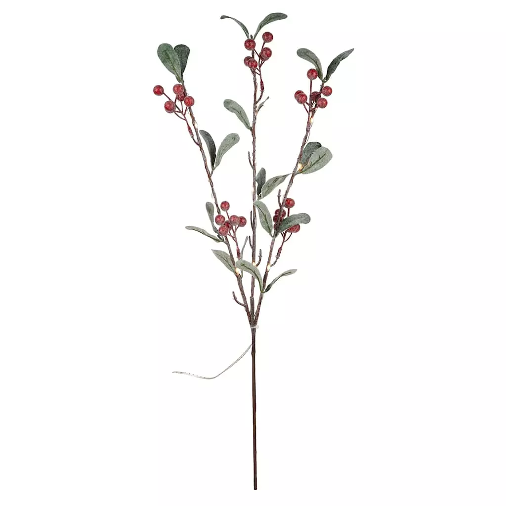 This merry twig with its cluster of red berries and leaves will add some joy to your Christmas decorating scheme. Branches are sprinkled holly berries and strung with battery operated warm white lights. This Christmas trimming is perfect for display over doors, windows, fireplace mantels or tabletops, in indoor or covered outdoor locations.