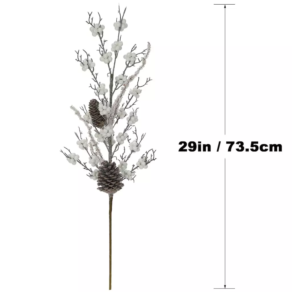 With frosty white berries and a dusting of glitter, this berry and pinecone stem will add a lovely shimmery touch to your Christmas floral projects. Use to bring depth to handmade wreaths and holiday dรฉcor or create a stunning arrangement along with frosted pine stems and brilliant red blooms in a tall vase.