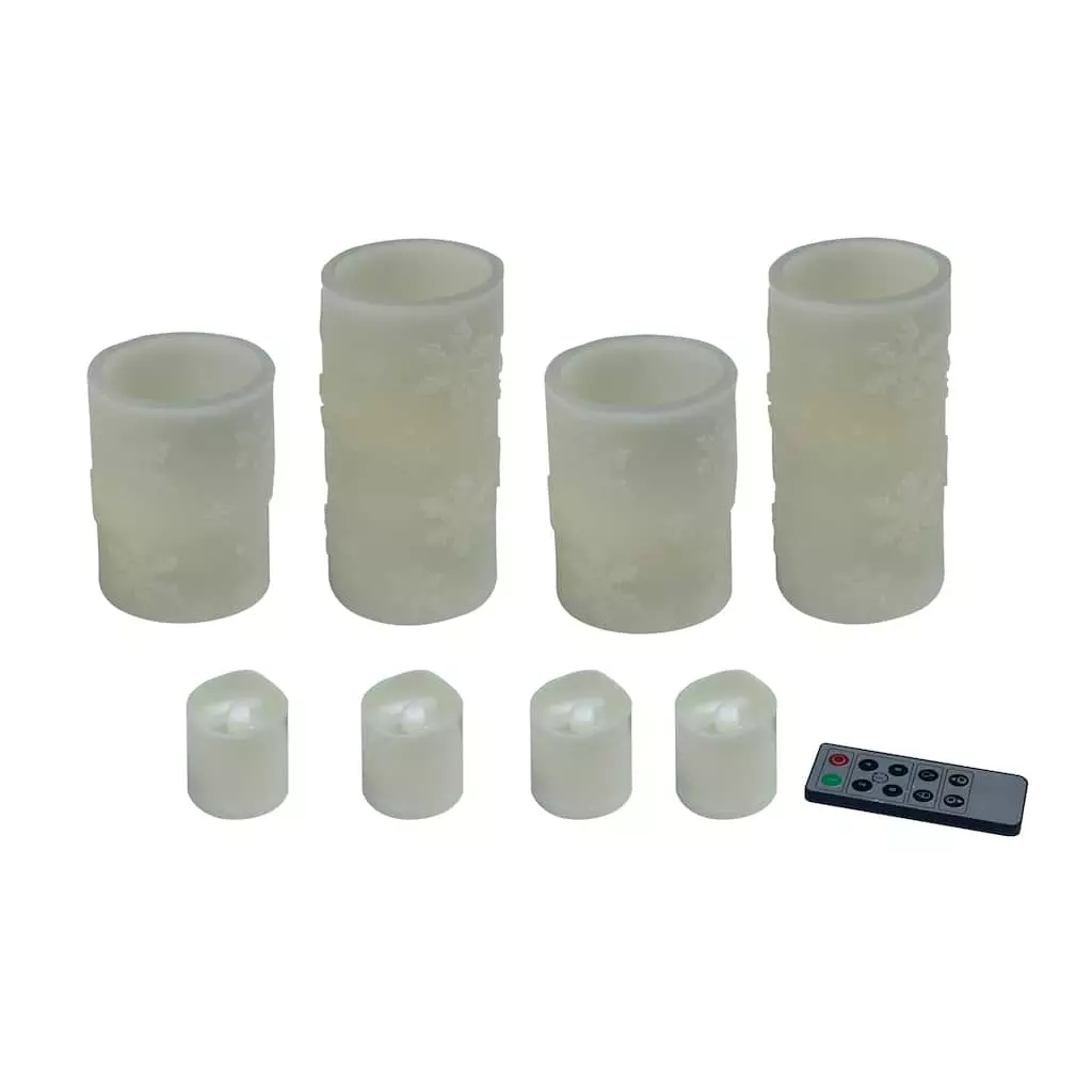 This white snowflake LED candle set includes 8 candles and 1 remote. Perfect for safely adding an ambient vibe to your dรฉcor, each candle will transform your table, shelf, or counter with the push of a button.