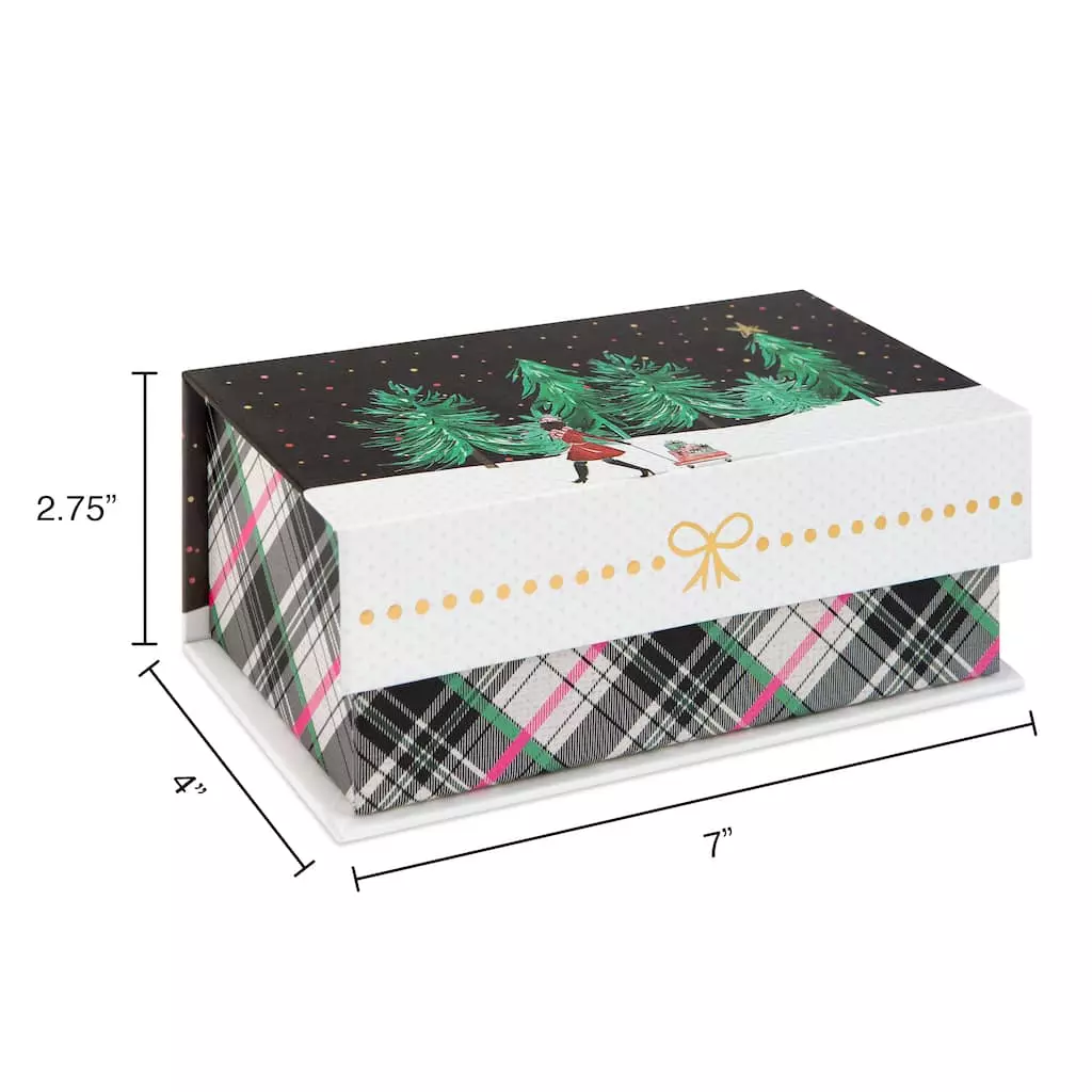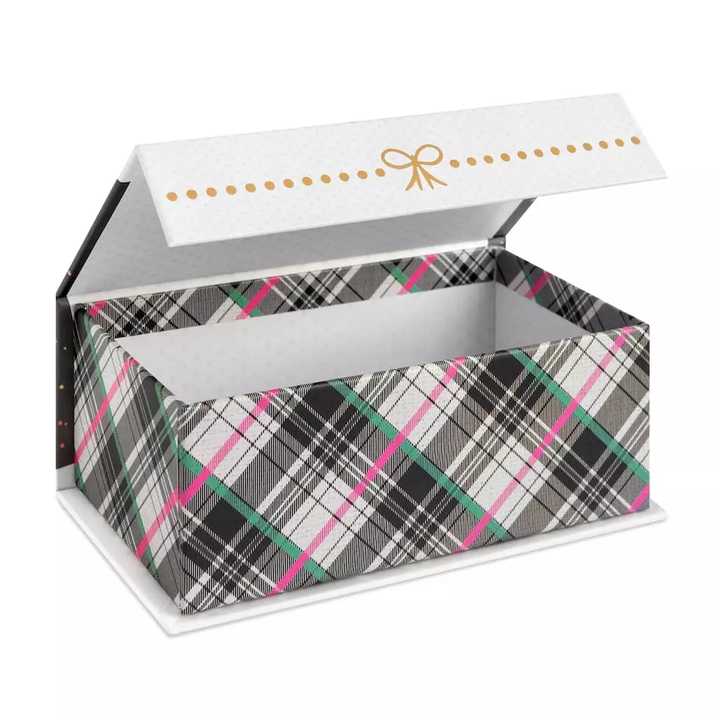 This flip top decorative box is the perfect piece for your home dรฉcor and storage. It features a seasonal design with a winter scene and a plaid design on the flap.